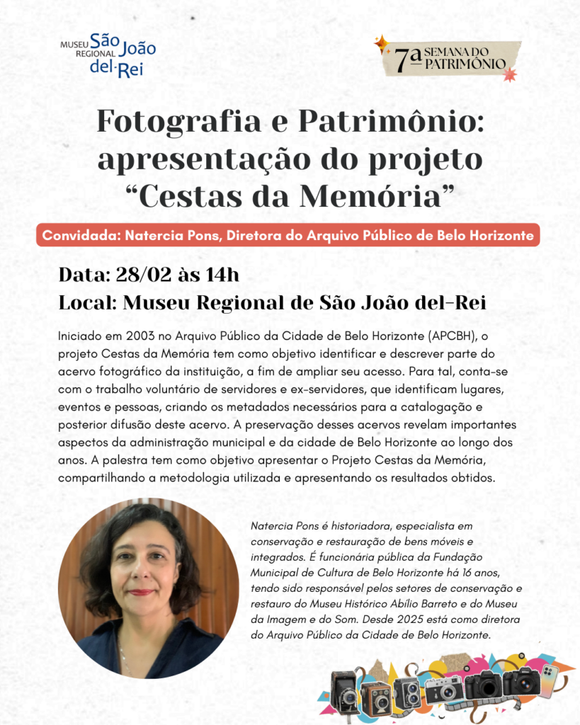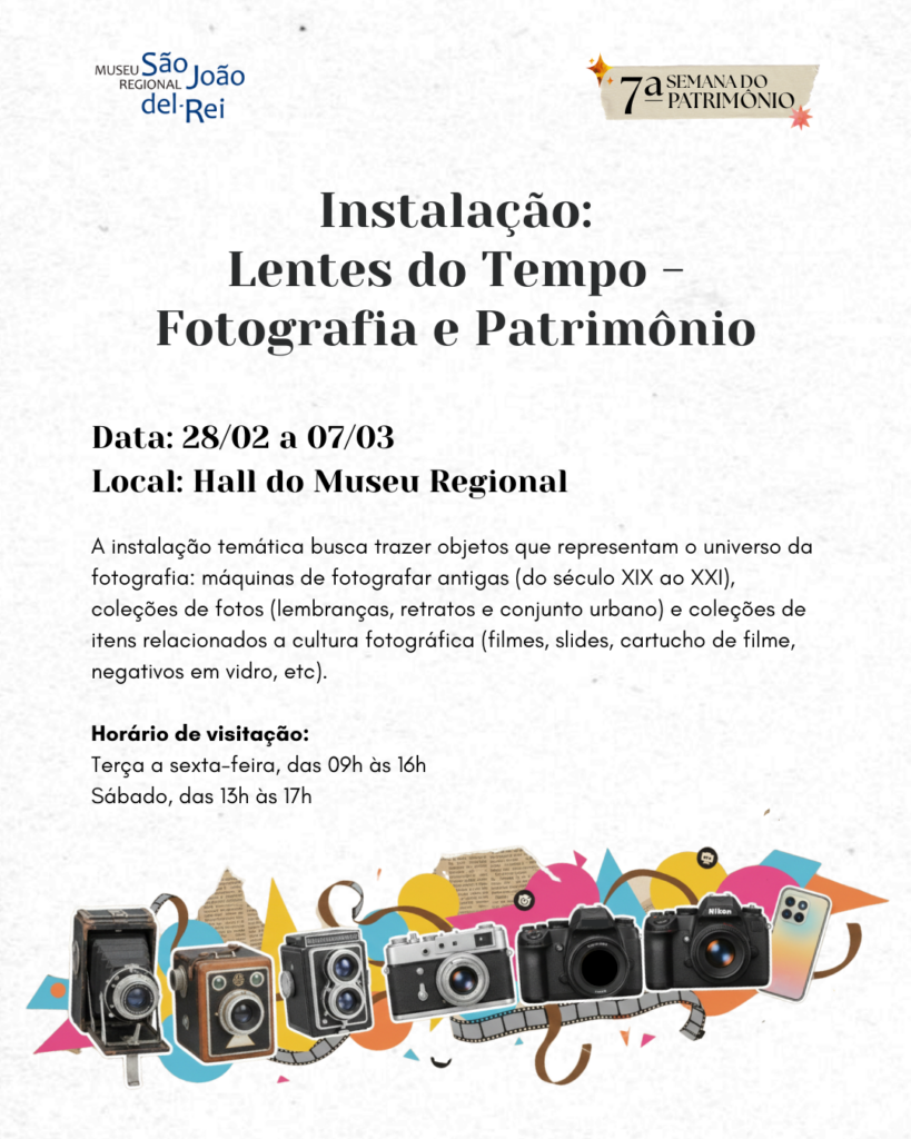 Entre os dias 28 de fevereiro e 07 de março, o Museu Regional de São João del-Rei realiza a 7ª Semana do Patrimônio, tendo como tema “Lentes do Tempo: Fotografia e Patrimônio”. Com o objetivo de explorar outros acervos do Museu escolhe-se como tema central dessa edição o patrimônio fotográfico. A fotografia e o ato de fotografar são importantes bens patrimoniais que transcendem a função de registro do patrimônio cultural ao capturar sua existência, constituindo-se também como importantes patrimônios por possuírem valor histórico, cultural e artístico.