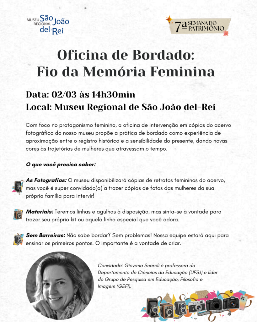 Já na segunda-feira, dia 02/03 às 14h30, ocorre a Oficina de Bordado: Fio da Memória Feminina. Com foco no protagonismo feminino, a oficina de intervenção em cópias do acervo fotográfico do nosso museu propõe a prática de bordado como experiência de aproximação entre o registro histórico e a sensibilidade do presente, dando novas cores às trajetórias de mulheres que atravessam o tempo. A convidada é Giovana Scareli, professora do Departamento de Ciências da Educação (UFSJ) e líder do Grupo de Pesquisa em Educação, Filosofia e Imagem (GEFI).