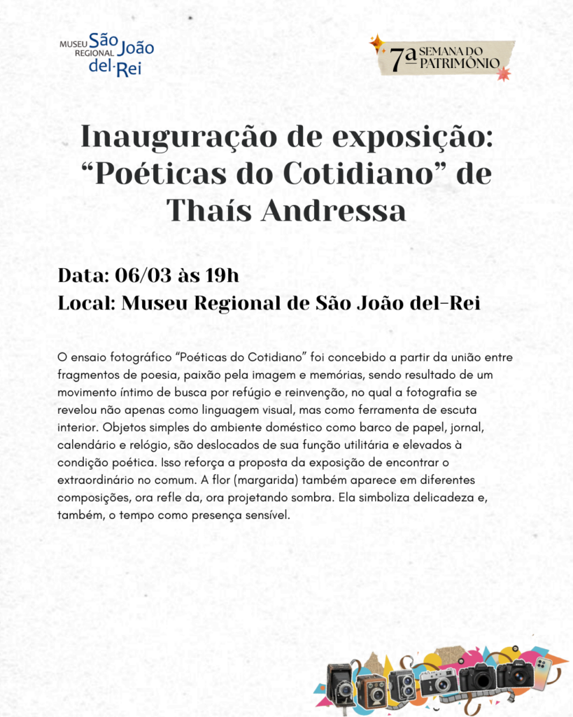Já na sexta-feira, dia 06, às 19h, acontece o evento oficial de inauguração da exposição “Poéticas do Cotidiano”, de Thaís Andressa. O ensaio fotográfico foi concebido a partir da união entre fragmentos de poesia, paixão pela imagem e memórias, sendo resultado de um movimento íntimo de busca por refúgio e reinvenção, no qual a fotografia se revelou não apenas como linguagem visual, mas como ferramenta de escuta interior. Objetos simples do ambiente doméstico como barco de papel, jornal, calendário e relógio, são deslocados de sua função utilitária e elevados à condição poética. Isso reforça a proposta da exposição de encontrar o extraordinário no comum. A flor (margarida) também aparece em diferentes composições, ora refletida, ora projetando sombra. Ela simboliza delicadeza e, também, o tempo como presença sensível.