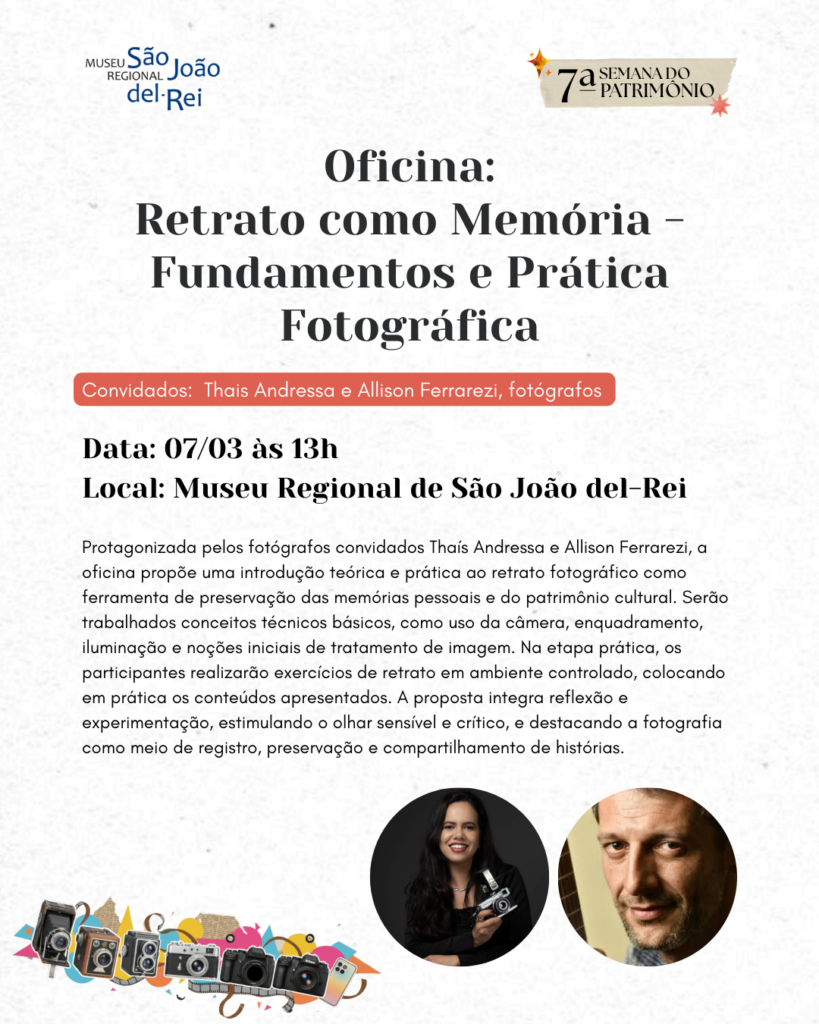 Finalizando a programação temos um sábado, 07/03, repleto de atividades. A partir das 13h, realiza-se a oficina Retrato como Memória – Fundamentos e Prática Fotográfica. Protagonizada pelos fotógrafos convidados Thaís Andressa e Allison Ferrarezi, a oficina propõe uma introdução teórica e prática ao retrato fotográfico como ferramenta de preservação das memórias pessoais e do patrimônio cultural. Por meio de um breve panorama histórico, a atividade apresenta referências fundamentais do retrato na fotografia, evidenciando sua importância na construção da memória individual e coletiva, tanto como registro documental quanto como expressão artística.