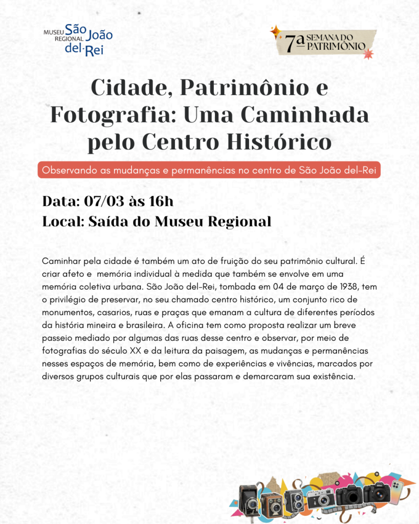 Posteriormente à oficina, às 16h, a equipe do Núcleo Educativo do Museu realiza a atividade Cidade, Patrimônio e Fotografia: Uma Caminhada pelo Centro Histórico. São João del-Rei, tombada em 04 de março de 1938, tem o privilégio de preservar, no seu chamado Centro Histórico, um conjunto rico de monumentos, casarios, ruas e praças que emanam a cultura de diferentes períodos da história mineira e brasileira. A oficina tem como proposta realizar um breve passeio mediado por algumas das ruas desse centro e observar, por meio de fotografias do século XX e da leitura da paisagem, as mudanças e permanências nesses espaços de memória, bem como de experiências e vivências, marcados por diversos grupos culturais que por elas passaram e demarcaram sua existência.