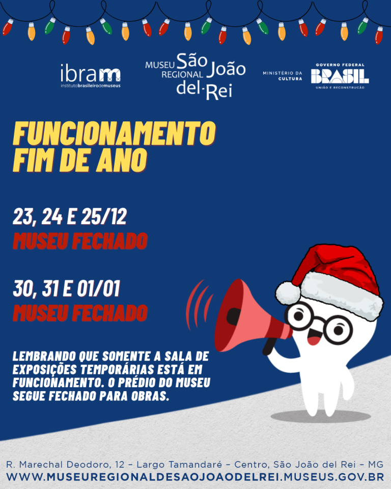 Em virtude da época de festas, o Museu Regional de São João del-Rei informa que nos dias 23, 24, 25, 30, 31/12 e 01/01 estará completamente fechado. É importante enfatizar que a exposição de longa duração do Museu Regional segue…