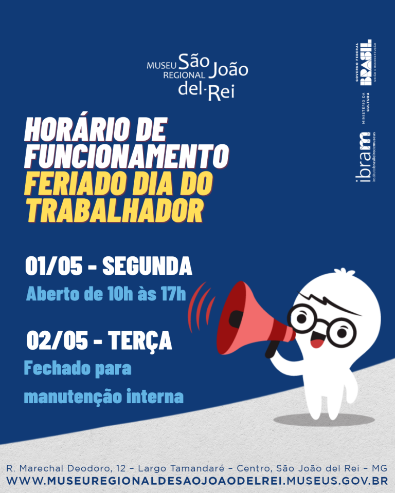 O Museu Regional de São João del-Rei informa que nesta segunda-feira, 01/05, feriado do Dia do Trabalhador, estará em funcionamento. A visitação pode ser feita a partir das 10h e encerra-se às 17h. Na terça-feira, dia 02, o Museu não…